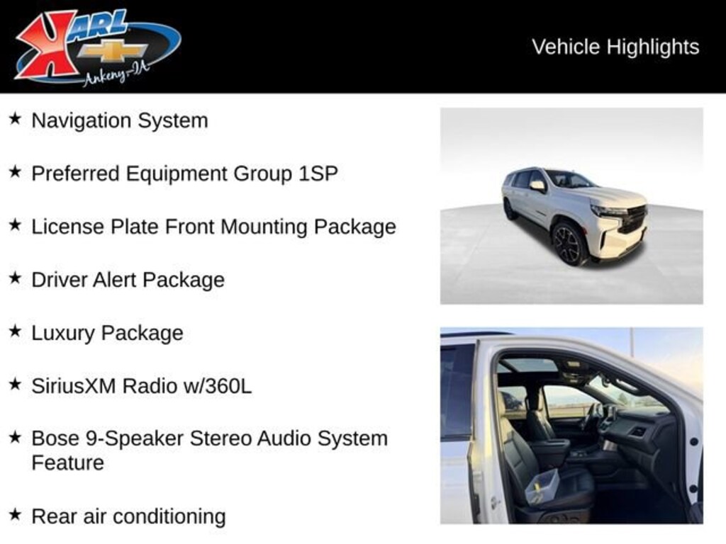 Recent Arrival! CARFAX One-Owner. Clean CARFAX. Certified. Iridescent Pearl Tricoat 2023 Chevrolet Suburban RST 4WD 4DR RST 3.0L I6 1st & 2nd Row Color-Keyed Carpeted Floor Mats, 3rd Row 60/40 Power-Folding Split-Bench, Adaptive Cruise Control, Apple CarPlay/Android Auto, Auto High-beam Headlights, Auto-Dimming Inside Rear-View Mirror, Black Illuminated Front Bowtie Emblem (LPO), Bose 9-Speaker Stereo Audio System Feature, Bright Front & Rear Door Sill Plates, Color-Keyed Carpeting Floor Covering, Driver & Front Outboard Passenger Airbags, Driver Alert Package, Dual-Pane Power Panoramic Sunroof, Enhanced Automatic Emergency Braking, Enhanced Driver Information Center, Floor Console w/Storage Area, Front dual zone A/C, Hands-Free Rear Power Programmable Liftgate, HD Surround Vision, Heated 2nd Row Outboard Seats, Heated Driver & Front Passenger Seats, Heated Steering Wheel, Infotainment Display, Lane Change Alert w/Side Blind Zone Alert, LED Daytime Running Lamps, License Plate Front Mounting Package, Luxury Package, Memory Settings, Memory Settings For Driver, Navigation System, Outside Heated Power-Adjustable Mirrors, Power driver seat, Power Release 2nd Row Bucket Seats, Power Tilt & Telescopic Steering Column, Preferred Equipment Group 1SP, Rain sensing wipers, Rear air conditioning, Rear Cross Traffic Alert, Rear Pedestrian Alert, Remote Start, SiriusXM Radio w/360L, Universal Home Remote, Wheels: 22 x 9 Bright Machined, Wireless Charging, Wrapped Steering Wheel. 20/26 City/Highway MPG 10-Speed Automatic 4WDAt Karl Chevrolet we want to help you find the best new or used car in Ankeny that suits your needs. Check out the 2023 Chevrolet Suburban For Sale in Ankeny, IA. When you buy a new car at Karl Chevrolet you know you're finding a vehicle you can rely on. We have a great selection of Platinum Quality Pre-Owned Vehicles. We also pride ourselves in creating a friendly atmosphere and reliable new car dealership that you can trust. Call us with any questions about our 2023 Chevrolet Suburban and our experts will be glad to help you! (515) 299-4300. *Equipment and options are generated by a 3rd party vendor, exact vehicle options may vary. Please see a salesperson for complete details and vehicle information.Certification Program Details: Karl Chevrolet of Ankeny, The Nation's #1 CarBravo certified dealer, where platinum quality vehicles and unmatched benefits come together! This vehicle qualifies for our CarBravo Certified program reserved for the highest-quality pre-owned vehicles that are 10 model years or newer and have less than 100,000 miles. Every CarBravo Certified vehicle includes: ? Comprehensive 126-Point Inspection Professionally inspected by factory-trained technicians to meet strict mechanical, safety, and cosmetic standards. ? 6-Month / 6,000-Mile Bumper-to-Bumper Limited Warranty Enjoy added peace of mind with extensive coverage from the day you drive off the lot. ? 24/7 Roadside Assistance & Courtesy Transportation Flat tire? Dead battery? Need a tow? You're covered anywhere, anytime throughout the warranty period. ? Vehicle History & Title Guarantee Clean title, completed safety recalls, and a full CARFAX® or AutoCheck® report provided for complete transparency. ? 10-Day / 500-Mile Exchange Promise If you donât absolutely love it, bring it back and exchange it no hassle, no stress. Experience peace of mind and premium protection exclusively from Karl Chevrolet of Ankeny, the Nation's #1 CarBravo Certified Deale