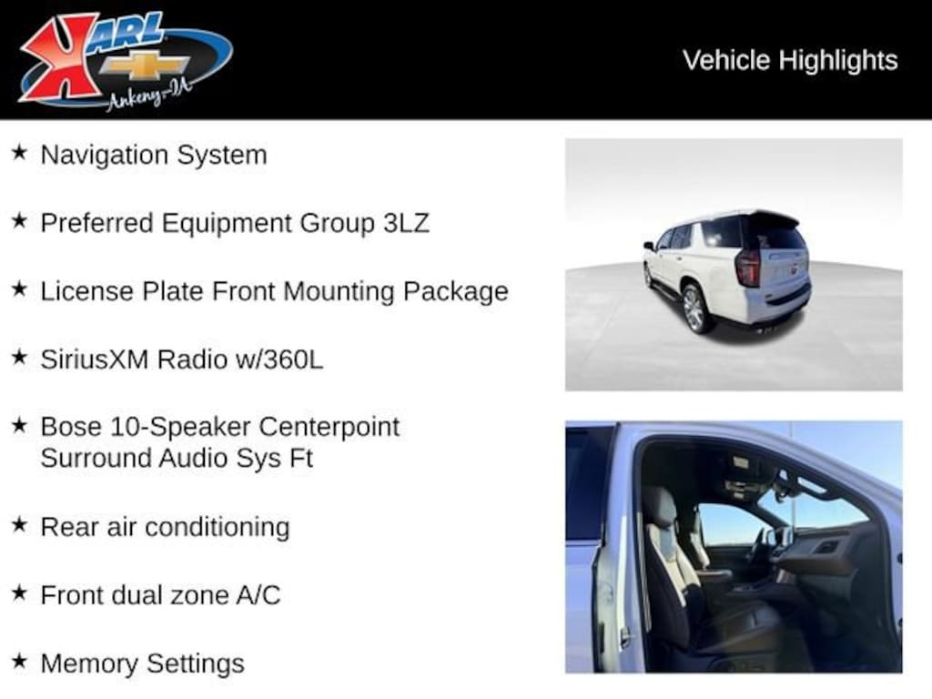 At Karl Chevrolet we want to help you find the best new or used car in Ankeny that suits your needs. When you buy a new car at Karl Chevrolet you know you're finding a vehicle you can rely on. We have a great selection of Platinum Quality Pre-Owned Vehicles. We also pride ourselves in creating a friendly atmosphere and a reliable Dealership that you can trust. Call us and our experts will be glad to help you! (515) 299-4300. *Equipment and options are generated by a 3rd party vendor, exact vehicle options may vary. Please see a sales