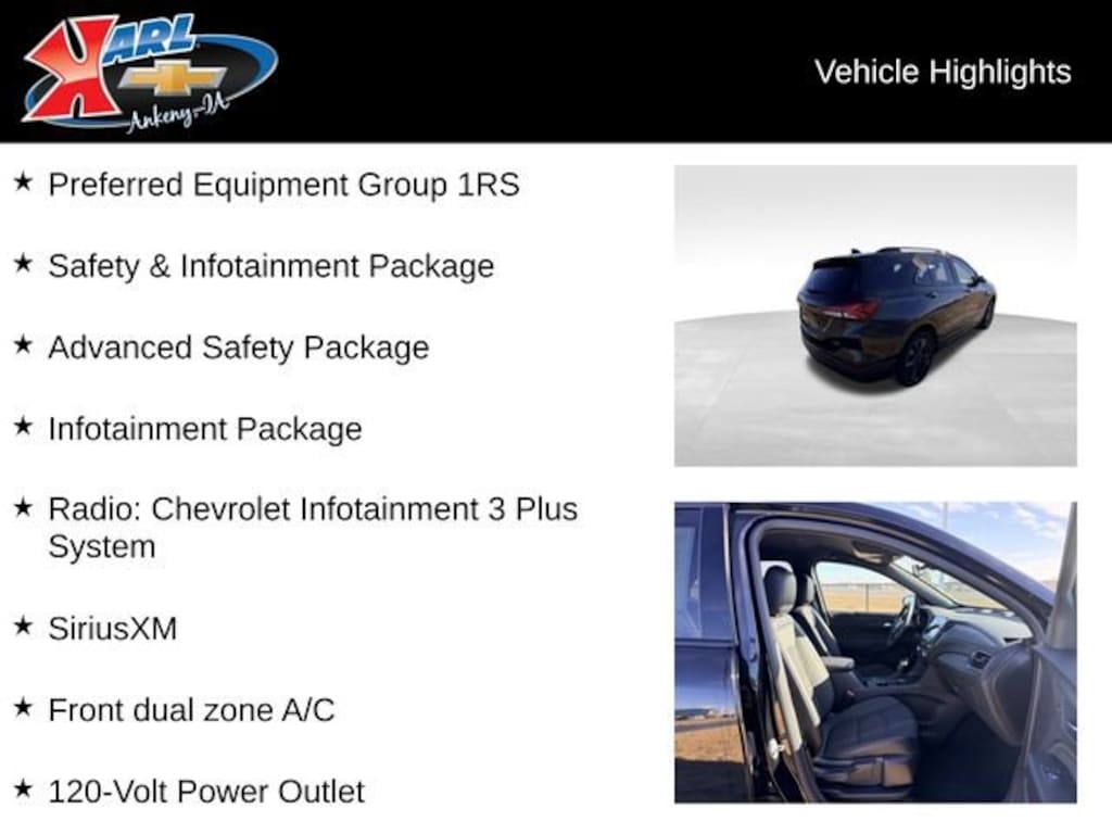 Certification Program Details: Karl Chevrolet of Ankeny, The Nation's #1 CarBravo Certified Dealer! Every CarBravo Certified vehicle includes: Comprehensive 126-Point Inspection Professionally inspected by factory-trained technicians to meet strict mechanical, safety, and cosmetic standards. 12-Month / 12,000-Mile Bumper-to-Bumper Limited Warranty Enjoy added peace of mind with extensive coverage from the day you drive off the lot. 24/7 Roadside Assistance & Courtesy Transportation Flat tire? Dead battery? Need a tow? You're covered anywhere, anytime throughout the warranty period. Vehicle History & Title Guarantee Clean title, completed safety recalls, and a full CARFAX® or AutoCheck® report provided for complete transparency. 10-Day / 500-Mile Exchange Promise If you don't absolutely love it, bring it back and exchange it no hassle, no stress. Experience peace of mind and premium protection exclusively from Karl Chevrolet of Ankeny, the Nation's #1 CarBravo Dealer! SAFETY AND INFOTAINMENT PACKAGE LICENSE PLATE FRONT MOUNTING PACKAGE Advanced Safety Package Infotainment Package Preferred Equipment Group 1RS Safety & Infotainment Package Radio: Chevrolet Infotainment 3 Plus System SiriusXM Front dual zone A/C 120-Volt Power Outlet Bluetooth® For Phone Power driver seat Power Liftgate Auto High-beam Headlights Adaptive Cruise Control Outside Heated Power-Adjustable Mirrors 2 USB Data Ports HD Surround Vision Heated Steering Wheel Heated Driver & Front Passenger SeatsThis 2024 Chevrolet Equinox RS AWD 4DR RS is a stunning and capable SUV that's ready to elevate your driving experience. Boasting a sleek black exterior and a well-appointed interior, this Equinox is the perfect blend of style and substance.Under the hood, you'll find a powerful 1.5L DOHC engine paired with a smooth 6-Speed Automatic Electronic with Overdrive transmission. With standard All-Wheel Drive, you'll enjoy confident handling and exceptional traction, whether you're navigating city streets or tackling the open road.The Equinox RS delivers an impressive balance of performance and efficiency, with an EPA-estimated 24 MPG in the city and 30 MPG on the highway. This means you can enjoy the thrill of driving without sacrificing fuel economy.Step inside and you'll be greeted by a wealth of advanced features, including the Chevrolet Infotainment 3 Plus System, SiriusXM, and a 120-Volt Power Outlet. Stay connected and entertained on every journey, while the dual-zone automatic climate control and heated front seats ensure your comfort.Safety is also a top priority, with features like Adaptive Cruise Control, Auto High-beam Headlights, and HD Surround Vision keeping you and your passengers secure. The Equinox RS is truly a well-rounded SUV that's ready to elevate your driving experience.This Chevrolet Equinox is also part of our exclusive CarBravo Certified program, which provides you with added peace of mind. Every CarBravo Certified vehicle undergoes a comprehensive 126-point inspection, comes with a 12-month/12,000-mile bumper-to-bumper warranty, and includes 24/7 roadside assistance and courtesy transportation. You can drive with confidence, knowing that this Equinox has been meticulously inspected and backed by our industry-leading certification program.At Karl Chevrolet we want to help you find the best new or used car in Ankeny that suits your needs. When you buy a new car at Karl Chevrolet you know you're finding a vehicle you can rely on. We have a great selection of Platinum Quality Pre-Owned Vehicles. We also pride ourselves in creating a friendly atmosphere and a reliable Dealership that you can trust. Call us and our experts will be glad to help you! (515) 299-4300. *Equipment and options are generated by a 3rd party vendor, exact vehicle options