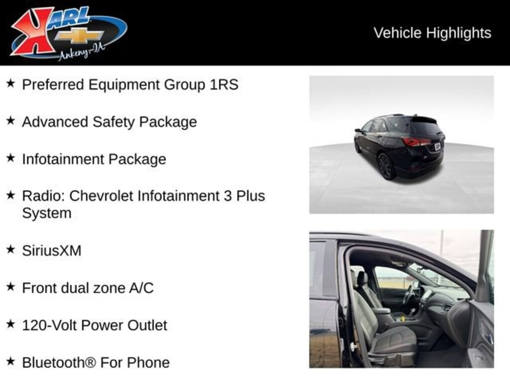 Certification Program Details: Karl Chevrolet of Ankeny, The Nation's #1 CarBravo Certified Dealer! Every CarBravo Certified vehicle includes: Comprehensive 126-Point Inspection Professionally inspected by factory-trained technicians to meet strict mechanical, safety, and cosmetic standards. 12-Month / 12,000-Mile Bumper-to-Bumper Limited Warranty Enjoy added peace of mind with extensive coverage from the day you drive off the lot. 24/7 Roadside Assistance & Courtesy Transportation Flat tire? Dead battery? Need a tow? You're covered anywhere, anytime throughout the warranty period. Vehicle History & Title Guarantee Clean title, completed safety recalls, and a full CARFAX® or AutoCheck® report provided for complete transparency. 10-Day / 500-Mile Exchange Promise If you don't absolutely love it, bring it back and exchange it no hassle, no stress. Experience peace of mind and premium protection exclusively from Karl Chevrolet of Ankeny, the Nation's #1 CarBravo Dealer! SAFETY AND INFOTAINMENT PACKAGE License Plate Front Mounting Package Advanced Safety Package Infotainment Package Preferred Equipment Group 1RS Radio: Chevrolet Infotainment 3 Plus System SiriusXM Front dual zone A/C 120-Volt Power Outlet Bluetooth® For Phone Power driver seat Auto High-beam Headlights Adaptive Cruise Control Outside Heated Power-Adjustable Mirrors 2 USB Data PortsThis 2024 Chevrolet Equinox RS AWD 4DR RS is a stylish and capable SUV that's perfect for your active lifestyle. With its sleek black exterior and spacious interior, this Equinox is sure to turn heads wherever you go. Under the hood, you'll find a powerful 1.5L DOHC engine paired with a smooth 6-speed automatic transmission, delivering a confident and efficient driving experience.Inside, the Equinox RS is loaded with premium features that will make every journey more enjoyable. The Chevrolet Infotainment 3 Plus System with SiriusXM keeps you connected and entertained, while the dual-zone automatic climate control and heated front seats ensure maximum comfort. Safety is also a top priority, with advanced features like Adaptive Cruise Control, Auto High-beam Headlights, and HD Surround Vision keeping you and your loved ones protected.Certified as part of the nation's #1 CarBravo program, this Equinox RS has undergone a comprehensive 126-point inspection and comes with a 12-month/12,000-mile bumper-to-bumper limited warranty, 24/7 roadside assistance, and a vehicle history and title guarantee. You can drive with confidence, knowing that this SUV has been meticulously evaluated and is ready to provide you with years of reliable service.Don't miss your chance to experience the exceptional quality and value of this 2024 Chevrolet Equinox RS. Visit Karl Chevrolet of Ankeny today and let our experts help you discover why this SUV is the perfect fit for your needs.At Karl Chevrolet we want to help you find the best new or used car in Ankeny that suits your needs. When you buy a new car at Karl Chevrolet you know you're finding a vehicle you can rely on. We have a great selection of Platinum Quality Pre-Owned Vehicles. We also pride ourselves in creating a friendly atmosphere and a reliable Dealership that you can trust. Call us and our experts will be glad to help you! (515) 299-4300. *Equipment and options are generated by a 3rd party vendor, exact vehicle options may vary. Please see a salesperson for complete details and vehicle information.