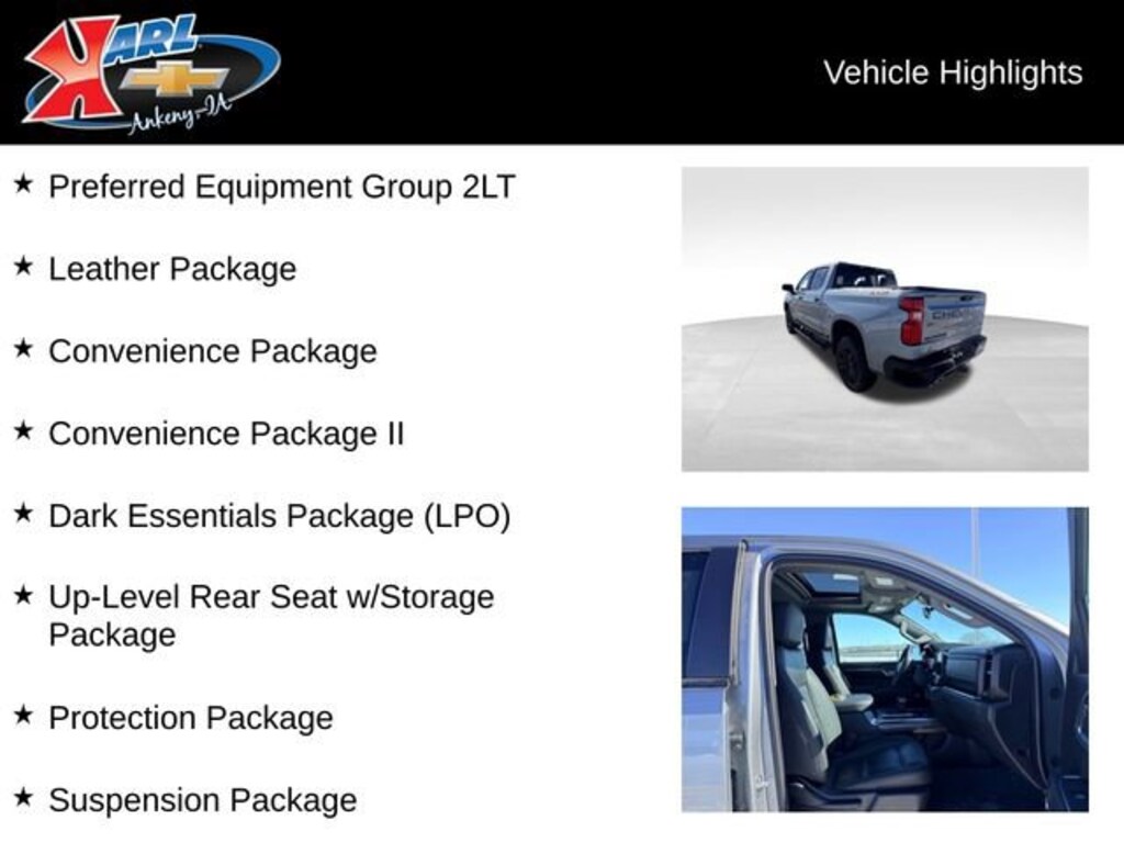 Certification Program Details: Karl Chevrolet of Ankeny, The Nation's #1 CarBravo Certified Dealer! Every CarBravo Certified vehicle includes: Comprehensive 126-Point Inspection Professionally inspected by factory-trained technicians to meet strict mechanical, safety, and cosmetic standards. 12-Month / 12,000-Mile Bumper-to-Bumper Limited Warranty Enjoy added peace of mind with extensive coverage from the day you drive off the lot. 24/7 Roadside Assistance & Courtesy Transportation Flat tire? Dead battery? Need a tow? You're covered anywhere, anytime throughout the warranty period. Vehicle History & Title Guarantee Clean title, completed safety recalls, and a full CARFAX® or AutoCheck® report provided for complete transparency. 10-Day / 500-Mile Exchange Promise If you don't absolutely love it, bring it back and exchange it — no hassle, no stress. Experience peace of mind and premium protection — exclusively from Karl Chevrolet of Ankeny, the Nation's #1 CarBravo Dealer!