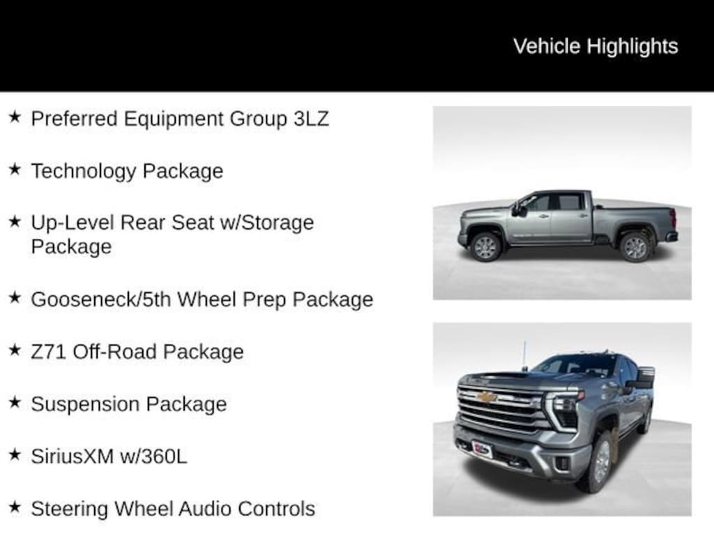 120-Volt Bed Mounted Power Outlet, 120-Volt Interior Power Outlet, 15 Diagonal Multicolor Head-Up Display, 170 Amp Alternator, 6 Rectangular Chromed Tubular Assist Steps, Adaptive Cruise Control, Auto-Dimming Inside Rear-View Mirror, Bed View Camera w/2 Trailer Camera Provisions, Black Chevytec Spray-On Bedliner, Bluetooth® For Phone, Chevrolet Connected Access Capable, Chrome Door Handles, Chrome Mirror Caps, Color-Keyed Carpeting Floor Covering, Compass, Deep-Tinted Glass, Electric Rear-Window Defogger, Electronic Cruise Control w/Set & Resume Speed, Front Carpeted Floor Mats, Front Chrome Recovery Hooks, Front LED Fog Lamps, Front Rain-Sensing Wipers, Gooseneck/5th Wheel Prep Package, Heated 2nd Row Outboard Seats, Heated Steering Wheel, Hill Descent Control, Hitch Guidance w/Hitch View, In-Vehicle Trailering App System, Keyless Open & Start, LED Cargo Area Lighting, Manual Tilt & Telescoping Steering Column, Off-Road Suspension, OnStar & Chevrolet Connected Services Capable, Polished Exhaust Tip, Power Door Locks, Power Front Windows w/Driver Express Up/Down, Power Front Windows w/Passenger Express Up/Down, Power Rear Windows w/Express Down, Power Sliding Rear Window w/Defogger, Preferred Equipment Group 3LZ, Push Button Start, Pwr Up/Down Tailgate Function w/Pwr Lock & Release, Rear Camera Mirror, Rear Carpeted Floor Mats, Rear Cross Traffic Alert, Rear Wheelhouse Liners, Remote Vehicle Starter System, SiriusXM w/360L, Standard Tailgate, Steering Wheel Audio Controls, Suspension Package, Technology Package, Trailer Camera Provisions, Ultrasonic Front & Rear Park Assist, Unauthorized Entry Theft-Deterrent System, Universal Home Remote, Up-Level Rear Seat w/Storage Package, Wi-Fi Hotspot Capable, Wireless Charging, Wireless Phone Projection, Wrapped Steering Wheel, Z71 Off-Road Package.