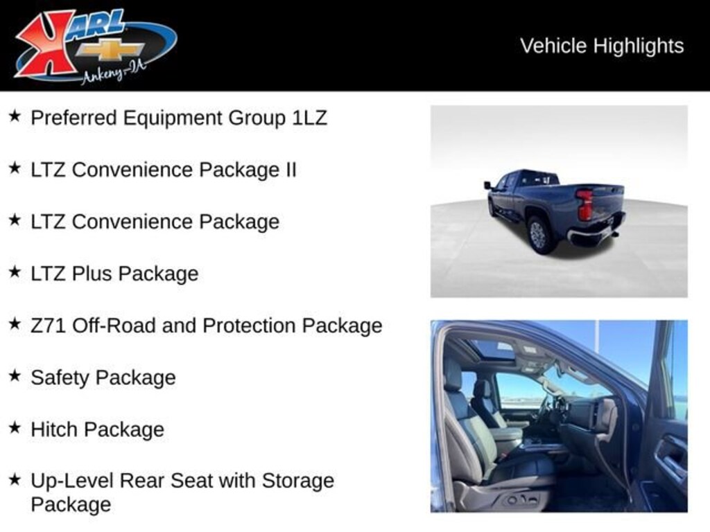 Certification Program Details: Karl Chevrolet of Ankeny, The Nation's #1 CarBravo Certified Dealer! Every CarBravo Certified vehicle includes: Comprehensive 126-Point Inspection Professionally inspected by factory-trained technicians to meet strict mechanical, safety, and cosmetic standards. 12-Month / 12,000-Mile Bumper-to-Bumper Limited Warranty Enjoy added peace of mind with extensive coverage from the day you drive off the lot. 24/7 Roadside Assistance & Courtesy Transportation Flat tire? Dead battery? Need a tow? You're covered anywhere, anytime throughout the warranty period. Vehicle History & Title Guarantee Clean title, completed safety recalls, and a full CARFAX® or AutoCheck® report provided for complete transparency. 10-Day / 500-Mile Exchange Promise If you don't absolutely love it, bring it back and exchange it no hassle, no stress. Experience peace of mind and premium protection exclusively from Karl Chevrolet of Ankeny, the Nation's #1 CarBravo Dealer!- 6.6L V8 Diesel Turbocharged (Duramax) (B20-Diesel Compatible, (470 hp [350.5 kW] @ 2800 rpm, 975 lb-ft of Torque [1322 Nm] @ 1600 rpm)- LTZ PLUS PACKAGE- Z71 OFF-ROAD AND PROTECTION PACKAGE- GOOSENECK/5TH WHEEL PREP PACKAGE- LTZ CONVENIENCE PACKAGE II- SUNROOF, POWER- ASSIST STEPS, CHROMED, 6 RECTANGULAR- TIRES, LT275/65R20 ALL-TERRAIN, BLACKWALL- ALTERNATOR, 220 AMPS- ENGINE BLOCK HEATER- LAMPS, SMOKED AMBER ROOF MARKER, (LED)This 2025 Chevrolet Silverado 2500HD LTZ 4WD CREW CAB 159 LTZ is a true workhorse, engineered to handle the toughest jobs with ease. Powered by the legendary Duramax 6.6L V8 Turbodiesel engine, this truck delivers an impressive 470 horsepower and an astounding 975 lb-ft of torque, giving you the muscle to tow, haul, and conquer any terrain. The 10-speed automatic transmission and 4WD system ensure seamless power delivery and confident handling, whether you're navigating rough job sites or adventuring off the beaten path.This Silverado is loaded with premium features that elevate both the driving experience and your comfort. The LTZ Plus Package, Z71 Off-Road and Protection Package, and LTZ Convenience Package II equip this truck with a wealth of advanced technology, premium amenities, and rugged off-road capabilities. Highlights include a powerful sunroof, chrome assist steps, all-terrain tires, and a suite of driver assistance and safety features that provide added peace of mind.With its impressive capabilities, refined interior, and comprehensive suite of features, this 2025 Chevrolet Silverado 2500HD LTZ is the ultimate heavy-duty pickup for work or play. Whether you're hauling heavy loads, towing a trailer, or exploring the great outdoors, this Silverado is ready to take on any challenge with confidence and style.This Silverado has been meticulously inspected and certified through the Karl Chevrolet CarBravo program, ensuring you can purchase with complete confidence. Every CarBravo Certified vehicle undergoes a rigorous 126-point inspection, comes with a 12-month/12,000-mile bumper-to-bumper warranty, and includes 24/7 roadside assistance and a vehicle history guarantee. You can drive away knowing you're getting a premium-quality vehicle backed by unparalleled peace of mind.At Karl Chevrolet, we want to help you find the best new or used car in Ankeny that suits your needs. When you buy a new car at Karl Chevrolet, you know you're finding a vehicle you can rely on. We have a great selection of Platinum Quality Pre-Owned Vehicles. We also pride ourselves in creating a friendly atmosphere and a reliable Dealership that you can trust. Call us and our experts will be glad to help you! (515) 299-4300. *Equipment and options are generated by a 3rd party vendor, exact vehicle options may vary. Please see a salesperson for complete details and vehicle information.