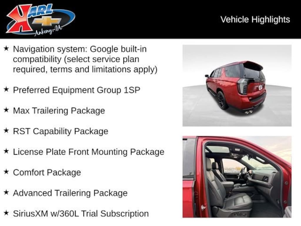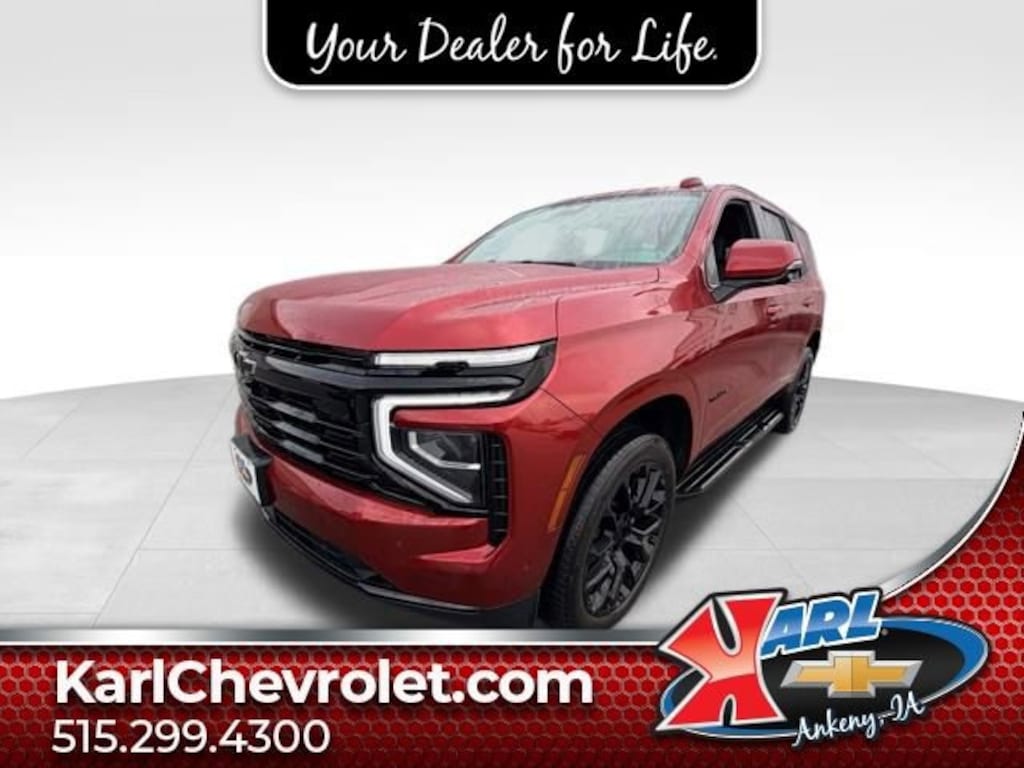 Recent Arrival! CARFAX One-Owner & Local Trade! Equipped With Running Boards! Clean CARFAX. Certified. Radiant Red Tintcoat 2025 Chevrolet Tahoe RST 4WD 4DR RST EcoTec3 6.2L V8 4WD, Jet Black/Victory Red Leather, 1st & 2nd Row Color-Keyed Carpeted Floor Mats, 2-Speed Active Electronic AutoTrac Transfer Case, 3-Spoke Wrapped Steering Wheel, 3rd Row 60/40 Power-Folding Split-Bench Seat, Advanced Trailering Package, Air Ride Adaptive Suspension, Apple CarPlay/Android Auto, Auto High-beam Headlights, Auto-Dimming Inside Rear-View Mirror, Blind Zone Steering Assist w/Trailering, Bose 10-Speaker Centerpoint Surround Audio Sys Ft, Bright Front & Rear Door Sill Plates, Color-Keyed Carpeting Floor Covering, Comfort Package, Dual Exhaust System, Dual-Pane Power Panoramic Sunroof, Exterior Parking Camera Rear, Floor Console, Floor Console w/Storage Area, Front dual zone A/C, Front LED Fog Lamps, Front Pedestrian & Bicyclist Braking, Frontal Driver & Outboard Passenger Airbags, Heated 2nd Row Outboard Seats, Heated Driver & Front Passenger Seats, Heated Steering Wheel, Hill Descent Control, Hitch View w/Pan/Zoom Image Adjustment, Integrated Trailer Brake Controller, LED Headlamps w/LED Daytime Running Lamps, LED Tail Lamps, License Plate Front Mounting Package, Magnetic Ride Control Suspension, Max Trailering Package, Memory Settings, Memory Settings for Driver, Navigation system: Google built-in compatibility, Outside Heated Power-Adjustable Mirrors, Power driver seat, Power Release 2nd Row Bucket Seats, Preferred Equipment Group 1SP, Rain sensing wipers, Rear air conditioning, Rear Power Liftgate, Remote Start, RST Capability Package, RST Exterior Features, Set of 4 Wheel Locks (LPO), SiriusXM w/360L Trial Subscription, Smart Trailer Integration Indicator, Universal Home Remote, USB Ports, Wheels: 22 x 9 Bright Machined, Wireless Phone Charging. 15/20 City/Highway MPG 10-Speed Automatic with Overdrive 4WDAt Karl Chevrolet we want to help you find the best new or used car in Ankeny that suits your needs. Check out the 2025 Chevrolet Tahoe For Sale in Ankeny, IA. When you buy a new car at Karl Chevrolet you know you're finding a vehicle you can rely on. We have a great selection of Platinum Quality Pre-Owned Vehicles. We also pride ourselves in creating a friendly atmosphere and reliable new car dealership that you can trust. Call us with any questions about our 2025 Chevrolet Tahoe and our experts will be glad to help you! (515) 299-4300. *Equipment and options are generated by a 3rd party vendor, exact vehicle options may vary. Please see a salesperson for complete details and vehicle information.Certification Program Details: Karl Chevrolet of Ankeny, your newest CarBravo dealer, where platinum quality vehicles and unmatched benefits come together! -Comprehensive Limited Bumper to Bumper Warranty. -24/7 Roadside Assistance: -Multi-Point Vehicle Inspection: Every vehicle undergoes a Platinum Quality Certified Inspection known throughout the industry to ensure top quality. -Vehicle Exchange Program. Within 10-Days and 500 miles -Complimentary Vehicle History Report -Nationwide Dealer Network Support: Enjoy the backing of the extensive CarBravo and GM dealership network. -OnStar and SiriusXM Trials: Enjoy connected services and entertainment with included trial subscriptions. -Terms and conditions may apply. With every vehicle purchased, you'll enjoy the peace of mind that comes with a limited warranty, 24/7 roadside assistance, and a comprehensive vehicle inspection.