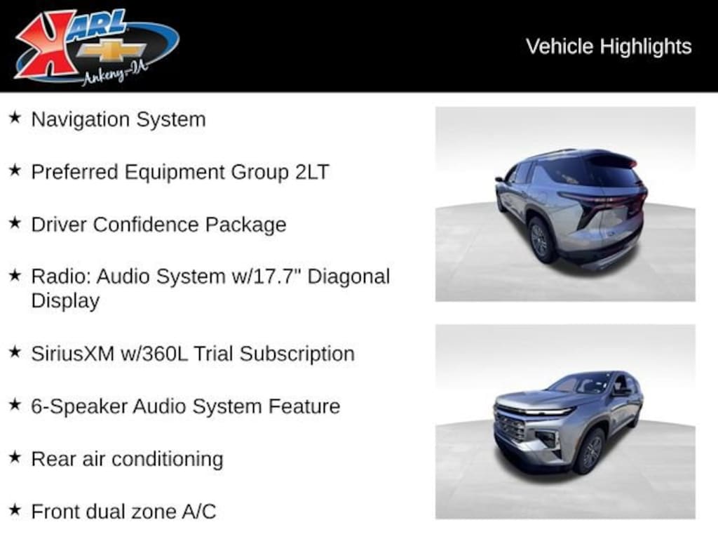 Recent Arrival! CARFAX One-Owner & Sold New at Karls! Clean CARFAX. Certified. Sterling Gray Metallic 2025 Chevrolet Traverse LT AWD 4DR LT W/2LT 2.5L DOHC AWD, 3rd row seats: split-bench, 6-Speaker Audio System Feature, Apple CarPlay/Android Auto, Auto High-beam Headlights, Driver Confidence Package, Front dual zone A/C, HD Surround Vision, Heated front seats, Heated steering wheel, Navigation System, Power driver seat, Power Liftgate, Power Outlet, Preferred Equipment Group 2LT, Radio: Audio System w/17.7 Diagonal Display, Rear air conditioning, Rear Pedestrian Alert, SiriusXM w/360L Trial Subscription, Traffic Sign Recognition, Wheels: 18 Grazen Metallic Machined-Face Aluminum. 19/24 City/Highway MPG 8-Speed Automatic AWDAt Karl Chevrolet we want to help you find the best new or used car in Ankeny that suits your needs. Check out the 2025 Chevrolet Traverse For Sale in Ankeny, IA. When you buy a new car at Karl Chevrolet you know you're finding a vehicle you can rely on. We have a great selection of Platinum Quality Pre-Owned Vehicles. We also pride ourselves in creating a friendly atmosphere and reliable new car dealership that you can trust. Call us with any questions about our 2025 Chevrolet Traverse and our experts will be glad to help you! (515) 299-4300. *Equipment and options are generated by a 3rd party vendor, exact vehicle options may vary. Please see a salesperson for complete details and vehicle information.Certification Program Details: Karl Chevrolet of Ankeny, your newest CarBravo dealer, where platinum quality vehicles and unmatched benefits come together! -Comprehensive Limited Bumper to Bumper Warranty. -24/7 Roadside Assistance: -Multi-Point Vehicle Inspection: Every vehicle undergoes a Platinum Quality Certified Inspection known throughout the industry to ensure top quality. -Vehicle Exchange Program. Within 10-Days and 500 miles -Complimentary Vehicle History Report -Nationwide Dealer Network Support: Enjoy the backing of the extensive CarBravo and GM dealership network. -OnStar and SiriusXM Trials: Enjoy connected services and entertainment with included trial subscriptions. -Terms and conditions may apply. With every vehicle purchased, you'll enjoy the peace of mind that comes with a limited warranty, 24/7 roadside assistance, and a comprehensive vehicle inspection.