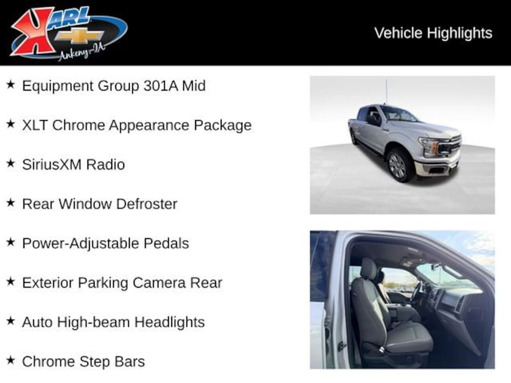 Recent Arrival! CARFAX One-Owner & Local Trade! Equipped With Running Boards, Bed liner, Mud Flaps & Tonneau COver! Clean CARFAX. Certified. Ingot Silver 2019 Ford F-150 XLT XLT 4WD SUPERCREW 5.5' BOX 5.0L V8 4WD, 2-Bar Style Grille w/Chrome 2 Minor Bars, 4.2 Productivity Screen in Instrument Cluster, 8-Way Power Driver Seat, AppLink/Apple CarPlay and Android Auto, Auto High-beam Headlights, Auto-Dimming Rear-View Mirror, BoxLink, Chrome Door & Tailgate Handles w/Body-Color Bezel, Chrome Step Bars, Class IV Trailer Hitch Receiver, Cloth 40/20/40 Front Seat, Equipment Group 301A Mid, Exterior Parking Camera Rear, Fixed Backlight w/Privacy Glass, Leather-Wrapped Steering Wheel, Power Glass Heated Sideview Mirrors, Power-Adjustable Pedals, Rear Under-Seat Storage, Rear Window Defroster, Single-Tip Chrome Exhaust, SiriusXM Radio, Voice-Activated Touchscreen Navigation, Wheels: 18 Chrome-Like PVD, XLT Chrome Appearance Package. 16/22 City/Highway MPG 10-Speed Automatic 4WDAt Karl Chevrolet we want to help you find the best new or used car in Ankeny that suits your needs. Check out the 2019 Ford F-150 For Sale in Ankeny, IA. When you buy a new car at Karl Chevrolet you know you're finding a vehicle you can rely on. We have a great selection of Platinum Quality Pre-Owned Vehicles. We also pride ourselves in creating a friendly atmosphere and reliable new car dealership that you can trust. Call us with any questions about our 2019 Ford F-150 and our experts will be glad to help you! (515) 299-4300. *Equipment and options are generated by a 3rd party vendor, exact vehicle options may vary. Please see a salesperson for complete details and vehicle information.Certification Program Details: Karl Chevrolet of Ankeny, your newest CarBravo dealer, where platinum quality vehicles and unmatched benefits come together! -Comprehensive Limited Bumper to Bumper Warranty. -24/7 Roadside Assistance: -Multi-Point Vehicle Inspection: Every vehicle undergoes a Platinum Quality Certified Inspection known throughout the industry to ensure top quality. -Vehicle Exchange Program. Within 10-Days and 500 miles -Complimentary Vehicle History Report -Nationwide Dealer Network Support: Enjoy the backing of the extensive CarBravo and GM dealership network. -OnStar and SiriusXM Trials: Enjoy connected services and entertainment with included trial subscriptions. -Terms and conditions may apply. With every vehicle purchased, you'll enjoy the peace of mind that comes with a limited warranty, 24/7 roadside assistance, and a comprehensive vehicle inspection.