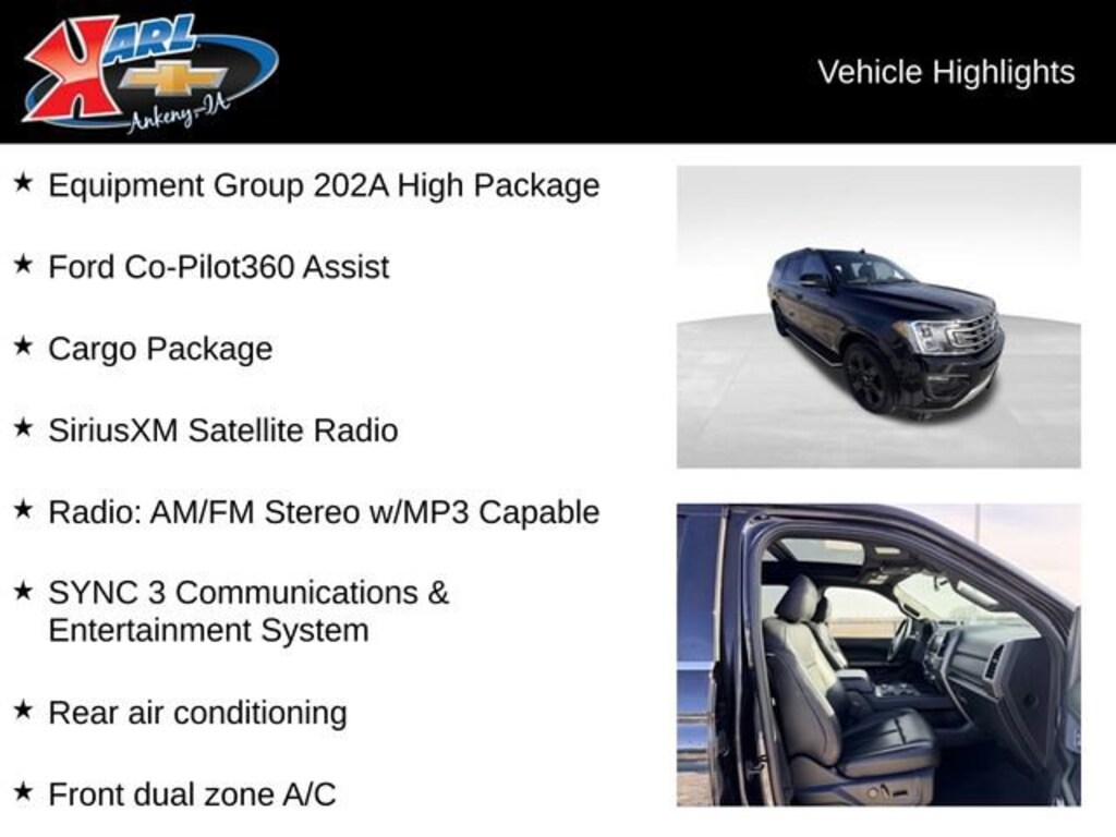 Certification Program Details: Karl Chevrolet of Ankeny, The Nation's #1 CarBravo Certified Dealer! Every CarBravo Certified vehicle includes: Comprehensive 126-Point Inspection Professionally inspected by factory-trained technicians to meet strict mechanical, safety, and cosmetic standards. 12-Month / 12,000-Mile Bumper-to-Bumper Limited Warranty Enjoy added peace of mind with extensive coverage from the day you drive off the lot. 24/7 Roadside Assistance & Courtesy Transportation Flat tire? Dead battery? Need a tow? You're covered anywhere, anytime throughout the warranty period. Vehicle History & Title Guarantee Clean title, completed safety recalls, and a full CARFAX® or AutoCheck® report provided for complete transparency. 10-Day / 500-Mile Exchange Promise If you don't absolutely love it, bring it back and exchange it no hassle, no stress. Experience peace of mind and premium protection exclusively from Karl Chevrolet of Ankeny, the Nation's #1 CarBravo Dealer! Cargo Package Equipment Group 202A High Package Ford Co-Pilot360 Assist Radio: AM/FM Stereo w/MP3 Capable SiriusXM Satellite Radio SYNC 3 Communications & Entertainment System Front dual zone A/C Rear air conditioning 110V/150W AC Power Outlet 3rd Row Vinyl Seat Power driver seat Remote Start 4-Door Intelligent Access (Lock/Unlock) SecuriCode Keyless Entry Pad Panoramic Vista Roof Power LiftgateThis 2021 Ford Expedition XLT 4x4 is the perfect combination of capability, comfort, and convenience. Powered by a potent EcoBoost 3.5L V6 engine paired with a smooth-shifting 10-speed automatic transmission, this Expedition delivers impressive performance and efficiency, with an EPA-estimated 22 mpg on the highway. Inside, the spacious and well-appointed cabin offers seating for up to eight passengers, with a versatile 2nd-row 40/20/40 split-fold seat and a power-folding 3rd row for maximum cargo flexibility.The Expedition's impressive list of standard features includes a host of advanced technologies, from the SYNC 3 infotainment system with voice-activated navigation and SiriusXM satellite radio, to Ford Co-Pilot360 Assist with adaptive cruise control and lane-keeping assist. Premium touches like a panoramic Vista Roof, heated and ventilated front seats, and a power liftgate elevate the driving experience, while the rugged 4x4 system and available towing package make this SUV a true workhorse.Whether you're hauling the family, towing a trailer, or embarking on an adventure, this 2021 Ford Expedition XLT 4x4 is ready to take you there in comfort, style, and confidence. Experience the perfect blend of capability and refinement - schedule a test drive today!This Expedition has been certified through the Karl Chevrolet CarBravo program, ensuring it has passed a rigorous 126-point inspection and comes with a 12-month/12,000-mile limited warranty, 24/7 roadside assistance, and a vehicle history report for complete transparency. You can drive with confidence, knowing this SUV has been meticulously evaluated and backed by the nation's #1 CarBravo dealer.At Karl Chevrolet we want to help you find the best new or used car in Ankeny that suits your needs. When you buy a new car at Karl Chevrolet you know you're finding a vehicle you can rely on. We have a great selection of Platinum Quality Pre-Owned Vehicles. We also pride ourselves in creating a friendly atmosphere and a reliable Dealership that you can trust. Call us and our experts will be glad to help you! (515) 299-4300. *Equipment and options are generated by a 3rd party vendor, exact vehicle options may vary. Please see a salesperson for complete details and vehicle information.