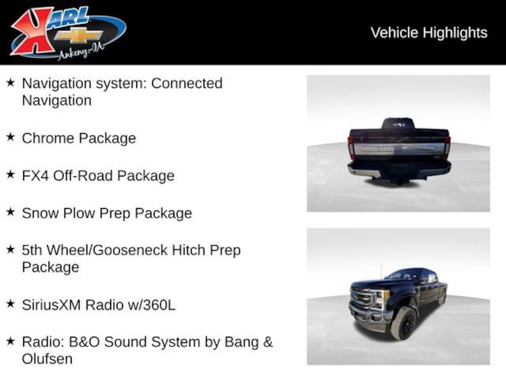 Recent Arrival! Local Trade! Lifted! Equipped With Power Running Boards & 22 Inch Black Fuel Wheels! Black Metallic 2022 Ford F-350SD King Ranch KING RANCH 4WD CREW Power Stroke 6.7L V8 DI 32V OHV Turbodiesel 4WD, 10 Speakers, 397 Amp Alternator, 5th Wheel/Gooseneck Hitch Prep Package, 6 Angular Bright Polished Step Bars, Adjustable pedals, Auto High-beam Headlights, Body-Color Door Handles w/Chrome Insert, Chrome Exhaust Tip, Chrome Package, Exterior Parking Camera Rear, Flow-Through Console, Front & Rear Wheel Well Liners (Pre-Installed), Front dual zone A/C, Front Splash Guards/Mud Flaps (Pre-Installed), FX4 Off-Road Package, Gooseneck Hitch Kit (Pre-Installed), Heated Rear Seats, Hill Descent Control, Connected Navigation, Off-Road Specifically Tuned Shock Absorbers, Power driver seat, PowerScope Trailer Tow Mirrors w/Heat, Radio: B&O Sound System by Bang & Olufsen, Rapid-Heat Supplemental Cab Heater, Rear Parking Sensors, Rear Splash Guards/Mud Flaps (Pre-Installed), SiriusXM Radio w/360L, Snow Plow Prep Package, SYNC 4 w/Enhanced Voice Recognition, Tough Bed Spray-In Bedliner, Unique Chrome Mirror Caps, Unique FX4 Off-Road Box Decal, Wheels: 20 Bright Machined Cast Aluminum. 10-Speed Automatic 4WDAt Karl Chevrolet we want to help you find the best new or used car in Ankeny that suits your needs. Check out the 2022 Ford F-350SD For Sale in Ankeny, IA. When you buy a new car at Karl Chevrolet you know you're finding a vehicle you can rely on. We have a great selection of Platinum Quality Pre-Owned Vehicles. We also pride ourselves in creating a friendly atmosphere and reliable new car dealership that you can trust. Call us with any questions about our 2022 Ford F-350SD and our experts will be glad to help you! (515) 299-4300. *Equipment and options are generated by a 3rd party vendor, exact vehicle options may vary. Please see a salesperson for complete details and vehicle information.