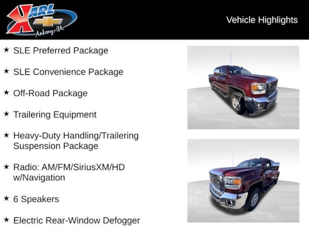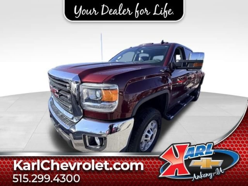 Recent Arrival! CARFAX One-Owner & Local Trade! Equipped With Running Boards, Tonneau Cover & 5th Wheel Hitch! Clean CARFAX. Certified. Deep Garnet Metallic 2016 GMC Sierra 2500HD SLE 4WD CREW CAB 153.7 6.0L 8-Cylinder SFI Flex Fuel OHV 6-Speed Automatic HD Electronic with Overdrive, 4WD, Black Cloth, 10-Way Power Driver's Seat Adjuster, 110-Volt AC Power Outlet, 4.2 Diagonal Color Display Driver Info Center, 6 Speakers, Alloy wheels, Bluetooth® For Phone, Dual-Zone Automatic Climate Control, Electric Rear-Window Defogger, Exterior Parking Camera Rear, EZ-Lift & Lower Tailgate, Front 40/20/40 Reclining Split-Bench Seat w/AG1, Front Halogen Fog Lamps, Heated Driver and Front Passenger Seats, Heavy-Duty Handling/Trailering Suspension Package, High-Intensity Discharge Headlights, Hill Descent Control, Manual Tilt-Wheel/Telescoping Steering Column, Off-Road Package, Power Windows w/Driver Express Up & Down, Power-Adjustable Pedals For Accelerator & Brake, Radio: AM/FM/SiriusXM/HD w/Navigation, Rear Vision Camera w/Dynamic Guide Lines, Remote Locking Tailgate, Remote Vehicle Starter System, SLE Convenience Package, SLE Preferred Package, Spray-On Pickup Box Bed Liner, Theft Deterrent System (Unauthorized Entry), Trailer Brake Controller, Trailering Equipment, Ultrasonic Rear Park Assist, Universal Home Remote, Z71 Badging. 6-Speed Automatic HD Electronic with Overdrive 4WDAt Karl Chevrolet we want to help you find the best new or used car in Ankeny that suits your needs. Check out the 2016 GMC Sierra 2500HD For Sale in Ankeny, IA. When you buy a new car at Karl Chevrolet you know you're finding a vehicle you can rely on. We have a great selection of Platinum Quality Pre-Owned Vehicles. We also pride ourselves in creating a friendly atmosphere and reliable new car dealership that you can trust. Call us with any questions about our 2016 GMC Sierra 2500HD and our experts will be glad to help you! (515) 299-4300. *Equipment and options are generated by a 3rd party vendor, exact vehicle options may vary. Please see a salesperson for complete details and vehicle information.Certification Program Details: Karl Chevrolet of Ankeny, your newest CarBravo dealer, where platinum quality vehicles and unmatched benefits come together! -Comprehensive Limited Bumper to Bumper Warranty. -24/7 Roadside Assistance: -Multi-Point Vehicle Inspection: Every vehicle undergoes a Platinum Quality Certified Inspection known throughout the industry to ensure top quality. -Vehicle Exchange Program. Within 10-Days and 500 miles -Complimentary Vehicle History Report -Nationwide Dealer Network Support: Enjoy the backing of the extensive CarBravo and GM dealership network. -OnStar and SiriusXM Trials: Enjoy connected services and entertainment with included trial subscriptions. -Terms and conditions may apply. With every vehicle purchased, you'll enjoy the peace of mind that comes with a limited warranty, 24/7 roadside assistance, and a comprehensive vehicle inspection.