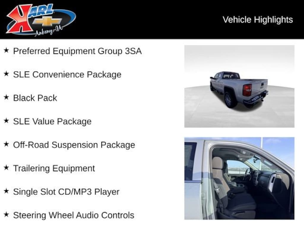 Recent Arrival! Certified. Local Trade! Equipped With Running Boards & 20 Inch Offload Chrome Wheels! Quicksilver Metallic 2018 GMC Sierra 1500 SLE 4WD DOUBLE CAB 143.5 SLE EcoTec3 5.3L V8 6-Speed Automatic Electronic with Overdrive, 4WD, Black Cloth, 10-Way Power Driver's Seat Adjuster, 110-Volt AC Power Outlet, 150 Amp Alternator, 2-Speed Active Electronic AutoTrac Transfer Case, 4.2 Diagonal Color Display Driver Info Center, 4 Round Black Tubular Assist Steps (LPO), Black Pack, Body Color Bodyside Moldings, Body Color Door Handles, Body Color Power Adjustable Heated Outside Mirrors, Body-Color Mirror Caps, Color-Keyed Carpeting, Deep-Tinted Glass, Driver & Front Passenger Illuminated Vanity Mirrors, Dual-Zone Automatic Climate Control, Electric Rear-Window Defogger, Exterior Parking Camera Rear, EZ Lift & Lower Tailgate, Front Frame-Mounted Black Recovery Hooks, GMC 4G LTE, GMC Connected Access, Heavy-Duty Rear Locking Differential, High-Intensity Discharge Headlights, Hill Descent Control, Leather Wrapped Steering Wheel w/Cruise Controls, LED Cargo Box Lighting, Off-Road Suspension Package, OnStar & GMC Connected Services Capable, Power Adjustable Pedals, Power Sliding Rear Window w/Defogger, Power Windows w/Driver Express Up & Down, Preferred Equipment Group 3SA, Premium audio system: GMC Infotainment System, Rear 60/40 Folding Bench Seat (Folds Up), Rear Wheelhouse Liners, Remote Keyless Entry, Remote Locking Tailgate, Remote Vehicle Starter System, Rubberized-Vinyl Front Floor Mats, Rubberized-Vinyl Rear Floor Mats, Single Slot CD/MP3 Player, Single-Zone Air Conditioning, SLE Convenience Package, SLE Value Package, Steering Wheel Audio Controls, Theft Deterrent System (Unauthorized Entry), Thin Profile LED Fog Lamps, Trailering Equipment, Ultrasonic Rear Park Assist, Universal Home Remote, Wheels: 18 x 8.5 Bright Machined Aluminum, Wheels: 22 5-Spoke Silver High Gloss Black (LPO), Wheels: 22 x 9 Steel Interim. 16/22 City/Highway MPG 6-Speed Automatic Electronic with Overdrive 4WDCertification Program Details: Karl Chevrolet of Ankeny, The Nation's #1 CarBravo certified dealer, where platinum quality vehicles and unmatched benefits come together! This vehicle qualifies for our CarBravo Certified program reserved for the highest-quality pre-owned vehicles that are 10 model years or newer and have less than 100,000 miles. Every CarBravo Certified vehicle includes: ? Comprehensive 126-Point Inspection Professionally inspected by factory-trained technicians to meet strict mechanical, safety, and cosmetic standards. ? 6-Month / 6,000-Mile Bumper-to-Bumper Limited Warranty Enjoy added peace of mind with extensive coverage from the day you drive off the lot. ? 24/7 Roadside Assistance & Courtesy Transportation Flat tire? Dead battery? Need a tow? You're covered anywhere, anytime throughout the warranty period. ? Vehicle History & Title Guarantee Clean title, completed safety recalls, and a full CARFAX® or AutoCheck® report provided for complete transparency. ? 10-Day / 500-Mile Exchange Promise If you don't absolutely love it, bring it back and exchange it no hassle, no stress. Experience peace of mind and premium protection exclusively from Karl Chevrolet of Ankeny, the Nation's #1 CarBravo Certified Dealer