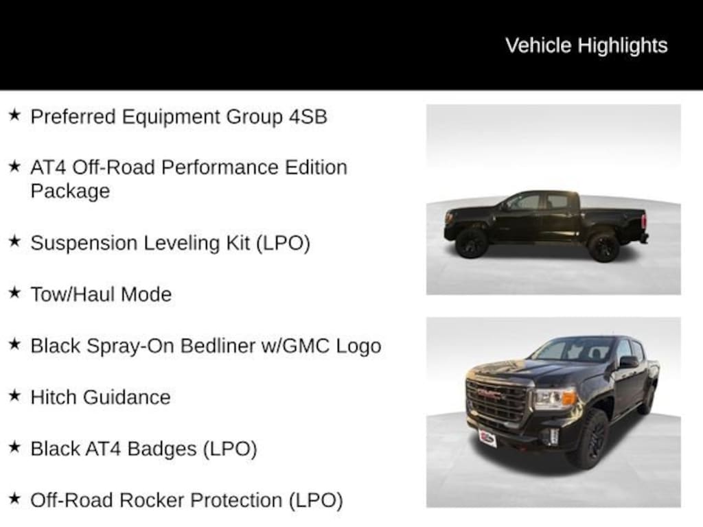 1st & 2nd Rows All-Weather Floor Liner (LPO), AT4 Off-Road Performance Edition Package, Black AT4 Badges (LPO), Black Spray-On Bedliner w/GMC Logo, GMC Black Chrome Exhaust Tip (LPO), Hitch Guidance, Off-Road Rocker Protection (LPO), Preferred Equipment Group 4SB, Suspension Leveling Kit (LPO), Tow/Haul Mode, Wheels: 17 x 8 Gloss-Black Aluminum.