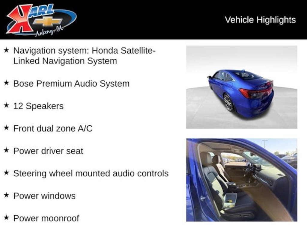 Recent Arrival! CARFAX One-Owner & Local Trade! Certified. Red 2024 Honda Civic Touring TOURING CVT 1.5L I4 DOHC 16V Ebony Leather, 12 Speakers, Apple CarPlay/Android Auto, Auto High-beam Headlights, Bose Premium Audio System, Exterior Parking Camera Rear, Front dual zone A/C, Heated Front Bucket Seats, Navigation system: Honda Satellite-Linked Navigation System, Power driver seat, Power moonroof, Power windows, Steering wheel mounted audio controls, Wheels: 18 Alloy w/Gloss Shark Gray Inserts. 31/38 City/Highway MPG CVT FWDAt Karl Chevrolet we want to help you find the best new or used car in Ankeny that suits your needs. Check out the 2024 Honda Civic For Sale in Ankeny, IA. When you buy a new car at Karl Chevrolet you know you're finding a vehicle you can rely on. We have a great selection of Platinum Quality Pre-Owned Vehicles. We also pride ourselves in creating a friendly atmosphere and reliable new car dealership that you can trust. Call us with any questions about our 2024 Honda Civic and our experts will be glad to help you! (515) 299-4300. *Equipment and options are generated by a 3rd party vendor, exact vehicle options may vary. Please see a salesperson for complete details and vehicle information.Certification Program Details: Karl Chevrolet of Ankeny, your newest CarBravo dealer, where platinum quality vehicles and unmatched benefits come together! -Comprehensive Limited Bumper to Bumper Warranty. -24/7 Roadside Assistance: -Multi-Point Vehicle Inspection: Every vehicle undergoes a Platinum Quality Certified Inspection known throughout the industry to ensure top quality. -Vehicle Exchange Program. Within 10-Days and 500 miles -Complimentary Vehicle History Report -Nationwide Dealer Network Support: Enjoy the backing of the extensive CarBravo and GM dealership network. -OnStar and SiriusXM Trials: Enjoy connected services and entertainment with included trial subscriptions. -Terms and conditions may apply. With every vehicle purchased, you'll enjoy the peace of mind that comes with a limited warranty, 24/7 roadside assistance, and a comprehensive vehicle inspection.