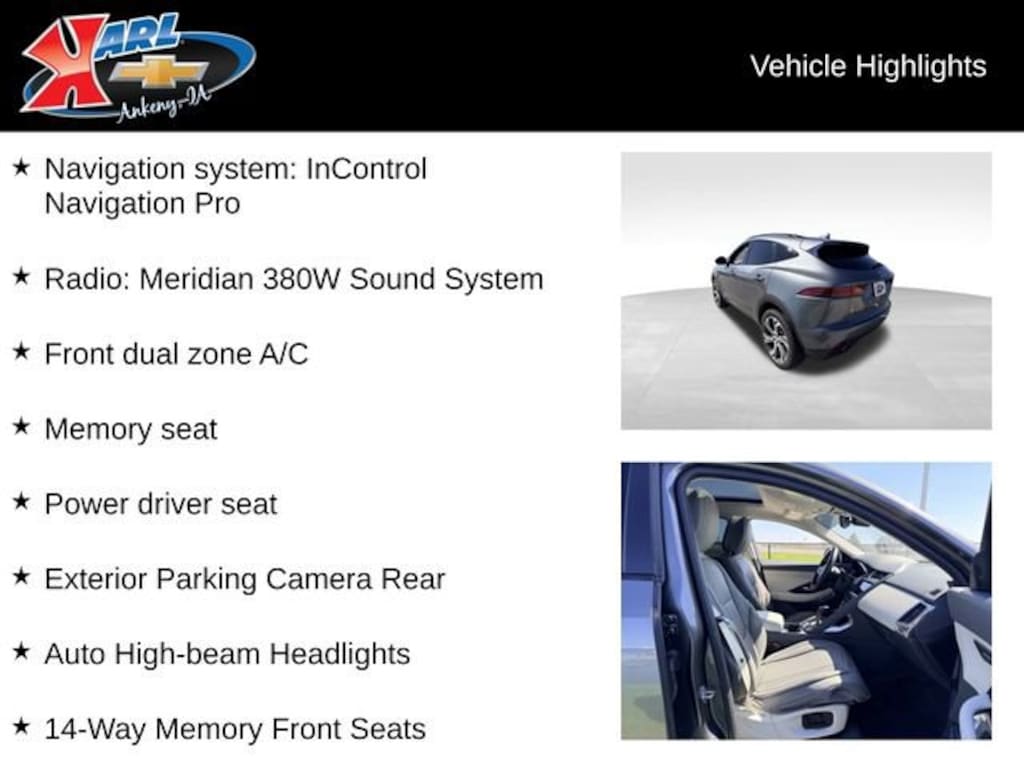 Certification Program Details: Karl Chevrolet of Ankeny, The Nation's #1 CarBravo Certified Dealer! Every CarBravo Certified vehicle includes: Comprehensive 126-Point Inspection Professionally inspected by factory-trained technicians to meet strict mechanical, safety, and cosmetic standards. 12-Month / 12,000-Mile Bumper-to-Bumper Limited Warranty Enjoy added peace of mind with extensive coverage from the day you drive off the lot. 24/7 Roadside Assistance & Courtesy Transportation Flat tire? Dead battery? Need a tow? You're covered anywhere, anytime throughout the warranty period. Vehicle History & Title Guarantee Clean title, completed safety recalls, and a full CARFAX® or AutoCheck® report provided for complete transparency. 10-Day / 500-Mile Exchange Promise If you don't absolutely love it, bring it back and exchange it no hassle, no stress. Experience peace of mind and premium protection exclusively from Karl Chevrolet of Ankeny, the Nation's #1 CarBravo Dealer!- Radio: Meridian 380W Sound System- Front dual zone A/C- Memory seat- Power driver seat- Auto High-beam Headlights- 14-Way Memory Front Seats- Apple CarPlay/Android Auto- Connect Pro Pack- Navigation Pro- Navigation system: InControl Navigation Pro- Exterior Parking Camera Rear- Wheels: 19 10 Spoke Sparkle SilverThis 2020 Jaguar E-PACE SE P250 AWD SE is a sophisticated and capable crossover that delivers a premium driving experience. Powered by a turbocharged 2.0L I4 engine paired with a smooth-shifting 9-speed automatic transmission, this all-wheel-drive Jaguar offers impressive performance and efficiency, earning up to 28 MPG on the highway.Inside, the E-PACE surrounds you with high-end materials and advanced technology, including a Meridian premium audio system, dual-zone climate control, and a state-of-the-art infotainment system with built-in navigation. The 14-way power driver's seat with memory settings ensures a perfect, personalized driving position, while the rear parking camera and 360-degree surround view system make maneuvering a breeze.As a CarBravo Certified pre-owned vehicle, this Jaguar E-PACE has undergone a rigorous 126-point inspection and comes with a comprehensive 12-month/12,000-mile bumper-to-bumper warranty, 24/7 roadside assistance, and a 10-day/500-mile exchange promise. You can drive with complete confidence, knowing this luxury crossover has been meticulously maintained and is ready to deliver an exceptional ownership experience.Don't miss your chance to experience the premium craftsmanship and advanced capabilities of this 2020 Jaguar E-PACE. Schedule a test drive today and discover why this crossover is the perfect blend of style, performance, and technology.At Karl Chevrolet we want to help you find the best new or used car in Ankeny that suits your needs. When you buy a new car at Karl Chevrolet you know you're finding a vehicle you can rely on. We have a great selection of Platinum Quality Pre-Owned Vehicles. We also pride ourselves in creating a friendly atmosphere and a reliable Dealership that you can trust. Call us and our experts will be glad to help you! (515) 299-4300. *Equipment and options are generated by a 3rd party vendor, exact vehicle options may vary. Please see a salesperson for complete details and vehicle information.