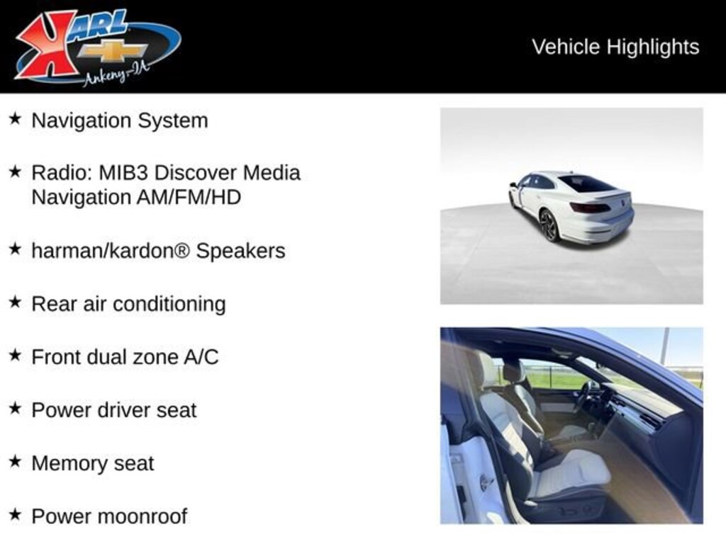 Certification Program Details: Karl Chevrolet of Ankeny, The Nation's #1 CarBravo Certified Dealer! Every CarBravo Certified vehicle includes: Comprehensive 126-Point Inspection Professionally inspected by factory-trained technicians to meet strict mechanical, safety, and cosmetic standards. 12-Month / 12,000-Mile Bumper-to-Bumper Limited Warranty Enjoy added peace of mind with extensive coverage from the day you drive off the lot. 24/7 Roadside Assistance & Courtesy Transportation Flat tire? Dead battery? Need a tow? You're covered anywhere, anytime throughout the warranty period. Vehicle History & Title Guarantee Clean title, completed safety recalls, and a full CARFAX® or AutoCheck® report provided for complete transparency. 10-Day / 500-Mile Exchange Promise If you don't absolutely love it, bring it back and exchange it no hassle, no stress. Experience peace of mind and premium protection exclusively from Karl Chevrolet of Ankeny, the Nation's #1 CarBravo Dealer!- Opal White Pearl exterior- Heated Front Comfort Sport Seats- Ventilated front seats- Power moonroof- Wheels: 20 x 8.0J 2-Tone Machined Alloy- harman/kardon® Speakers- Radio: MIB3 Discover Media Navigation AM/FM/HD- Front dual zone A/C- Rear air conditioning- Memory seat- Power driver seat- Auto High-beam Headlights- Heated steering wheel- Navigation System- Heated rear seatsThis 2023 Volkswagen Arteon 2.0T SEL Premium R-Line SEL PREMIUM R-LINE 4MOTION is a premium, well-equipped vehicle that offers an exceptional driving experience. With its powerful 2.0L turbocharged engine, advanced all-wheel-drive system, and sleek, sporty styling, this Arteon is the perfect blend of performance and sophistication.Inside, you'll find a wealth of premium features designed to elevate your driving enjoyment. The luxurious Nappa leather seating, heated and ventilated front seats, and heated steering wheel provide unparalleled comfort, while the state-of-the-art infotainment system with navigation, premium harman/kardon audio, and wireless connectivity keep you connected and entertained. The panoramic power moonroof and dual-zone climate control add to the overall sense of refinement.With its impressive fuel efficiency, advanced safety technologies, and exceptional build quality, this Volkswagen Arteon is a true standout in the premium sedan segment. Whether you're commuting in style or embarking on a road trip, this vehicle is sure to exceed your expectations.We're proud to offer this Arteon as part of our exclusive CarBravo Certified Pre-Owned program. This means it has undergone a comprehensive 126-point inspection by our factory-trained technicians, ensuring it meets the highest standards of quality and performance. You'll also enjoy the peace of mind of a 12-month/12,000-mile bumper-to-bumper limited warranty, 24/7 roadside assistance, and a 10-day/500-mile exchange promise.At Karl Chevrolet we want to help you find the best new or used car in Ankeny that suits your needs. When you buy a new car at Karl Chevrolet you know you're finding a vehicle you can rely on. We have a great selection of Platinum Quality Pre-Owned Vehicles. We also pride ourselves in creating a friendly atmosphere and a reliable Dealership that you can trust. Call us and our experts will be glad to help you! (515) 299-4300. *Equipment and options are generated by a 3rd party vendor, exact vehicle options may vary. Please see a salesperson for complete details and vehicle information.